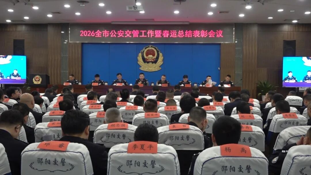 会上,支队党委书记、支队长肖绍荣通报全市交管工作情况,支队党委委员、副支队长王忠表扬2026年全市公安机关春运交通安保工作成绩突出集体,支队党委委员、副支队长彭文主持会议。邵东市公安局、新宁县公安局、邵阳市公安局北塔分局先后做春运安保工作先进典型发言。市公安局相关部门负责人、各县市区公安局分管交管工作的副局长、支队党委班子成员、各县市区公安局交管大队大队长、支队各大队负责人在支队视频会议主会场参会,各县市区公安局交管大队其他大队领导、中层骨干分别在大队分会场参会。